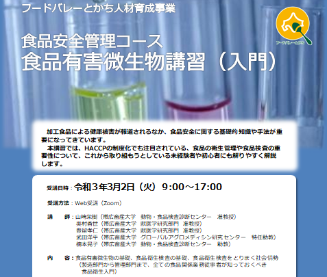 令和2年度フードバレーとかち人材育成事業 食品安全管理コース「食品有害微生物講習(入門)」のご案内 開催日 2021年03月02日 お申込み受付 2021年2月2日 〜 2021年2月19日 受付終了 詳細は産学連携センターのページをご覧ください。 2021年2月3日 投稿ナビゲーション 前へ一覧次へ