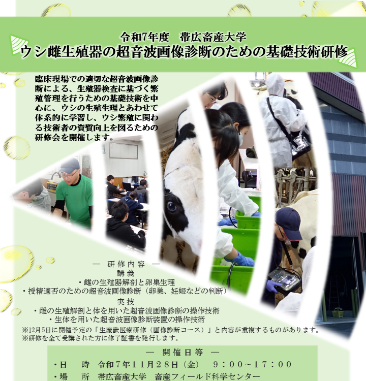 ウシ雌生殖器の超音波画像診断のための基礎技術研修 開催日 2025年11月28日 お申込み受付 2025年9月30日 〜 2025年10月31日 受付中 詳細や参加申込については、高度人材共創センターのページをご覧ください。 2025年9月30日 投稿ナビゲーション 前へ一覧次へ