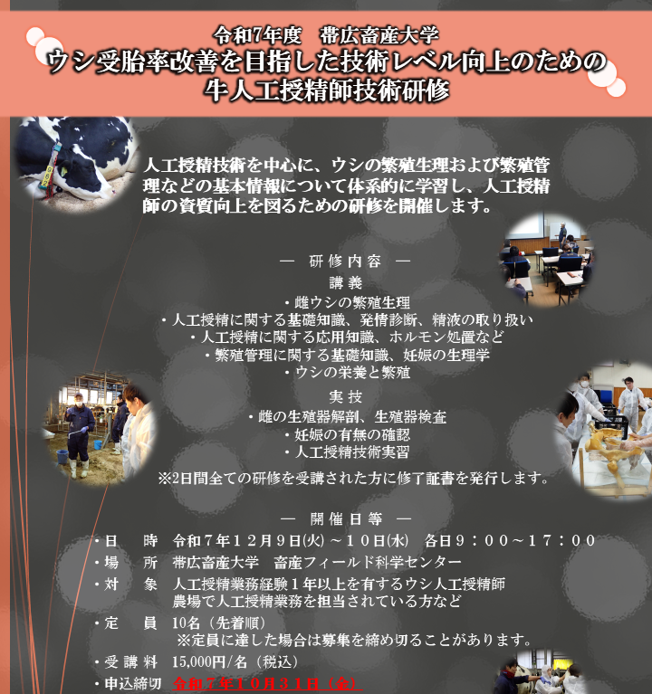 ウシ受胎率改善を目指した技術レベル向上のための牛人工授精師技術研修 開催日 2025年12月09日〜2025年12月10日 お申込み受付 2025年9月30日 〜 2025年10月31日 受付中 詳細や参加申込については、高度人材共創センターのページをご覧ください。 2025年9月30日 投稿ナビゲーション 前へ一覧次へ