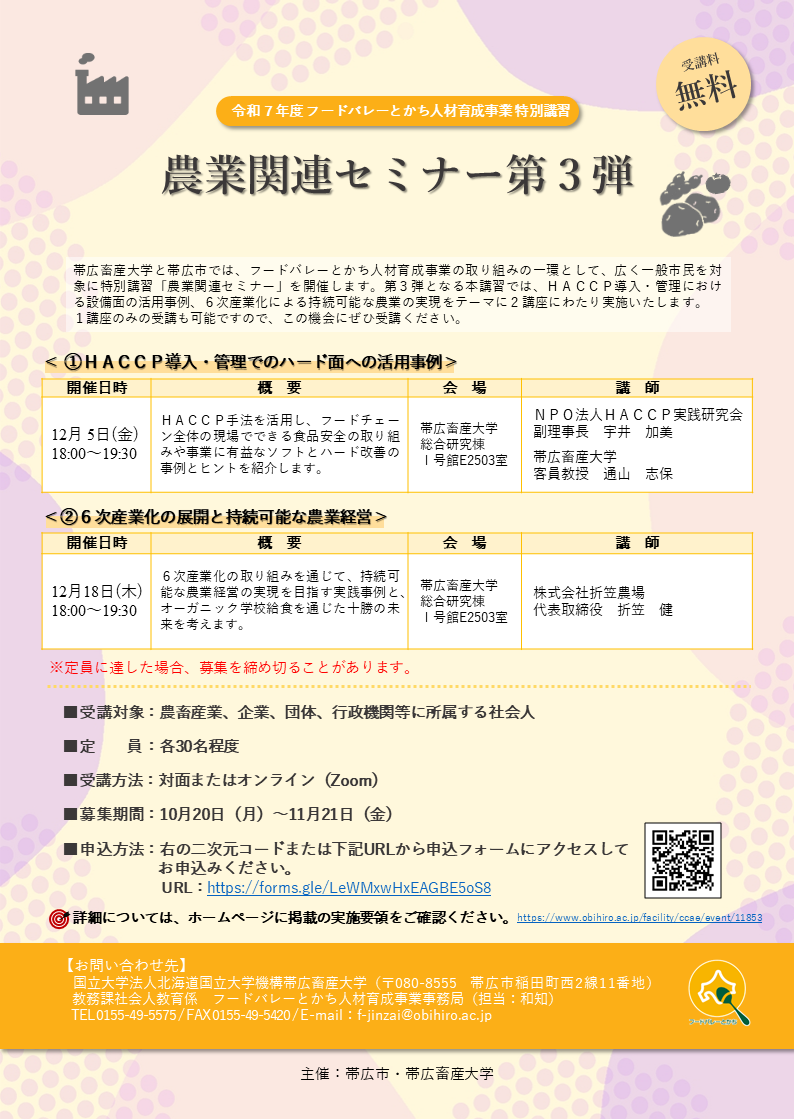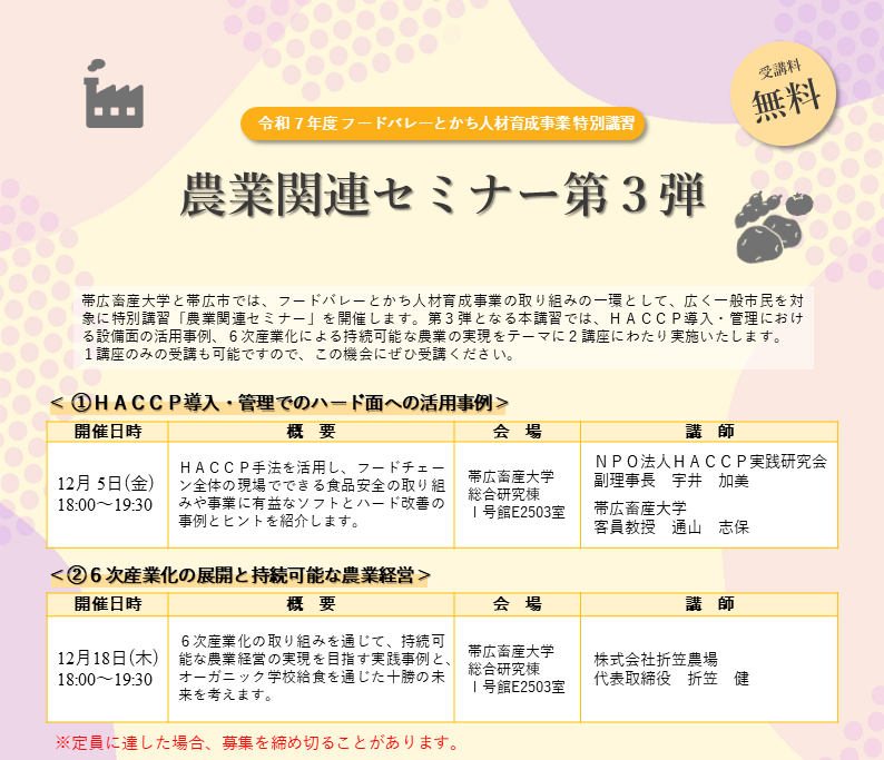 フードバレーとかち 人材育成事業特別講習「農業関連セミナー第3弾」 開催日 2025年12月05日〜2025年12月18日 お申込み受付 2025年10月20日 〜 2025年11月21日 定員到達次第締め切ります。 受付中 詳細や参加申込については、高度人材共創センターのページをご覧ください。 2025年10月20日 投稿ナビゲーション 前へ一覧次へ