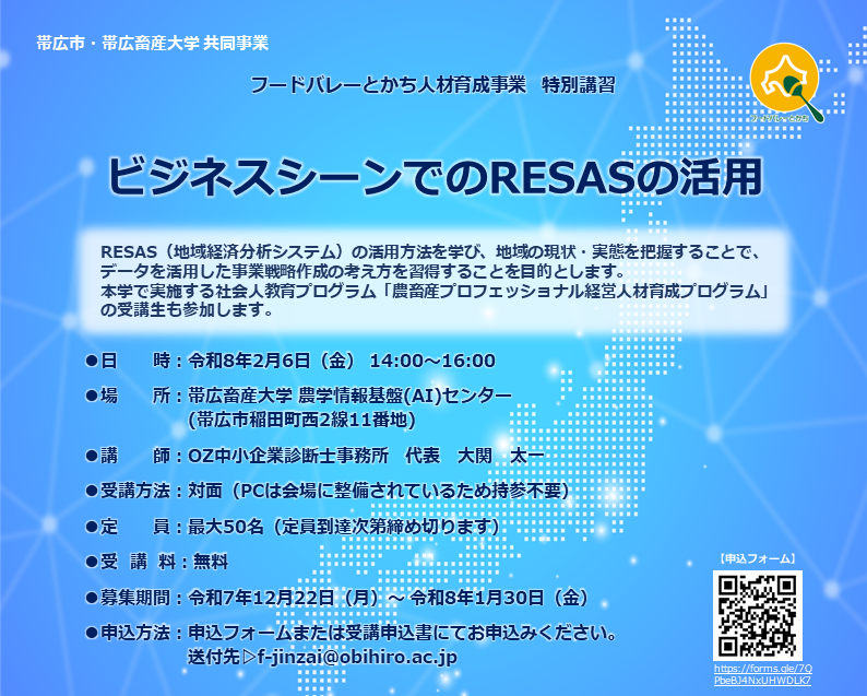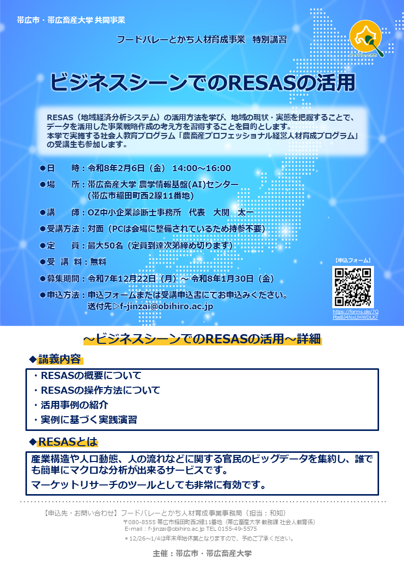 フードバレーとかち 人材育成事業特別講習「ビジネスシーンでのRESASの活用」 開催日 2026年02月06日 お申込み受付 2025年12月22日 〜 2026年1月30日 定員到達次第締め切ります。 受付中 詳細や参加申込については、高度人材共創センターのページをご覧ください。 2025年12月22日 投稿ナビゲーション 前へ一覧次へ