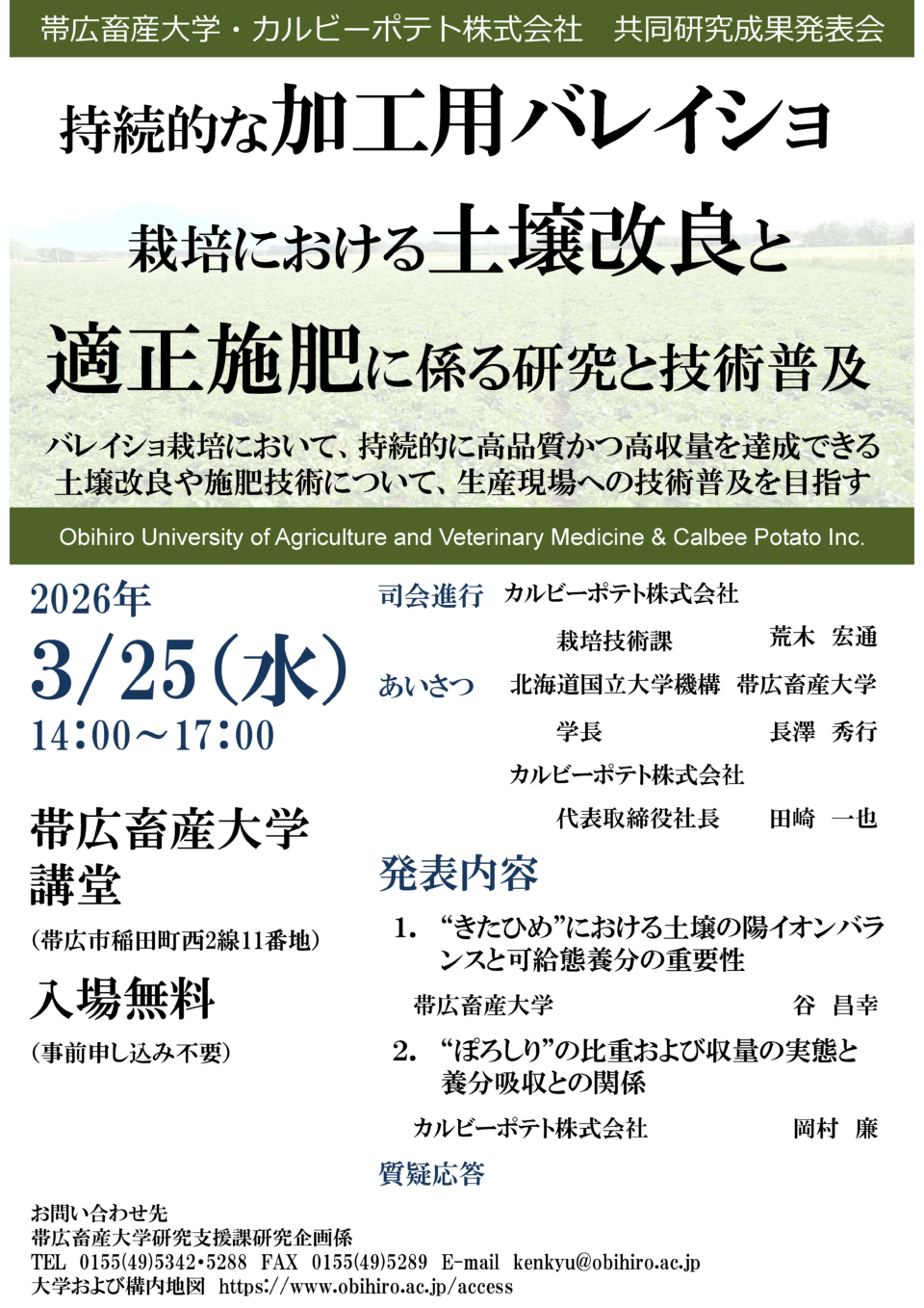 帯広畜産大学とカルビーポテト株式会社は、バレイショ栽培において持続的に高品質かつ高収量を実現するための土壌改良および施肥技術の確立と、生産現場への技術普及を目的とした共同研究を実施してまいりました。このたび、本年度に得られた研究成果について広く紹介するため、成果報告会を開催いたします。