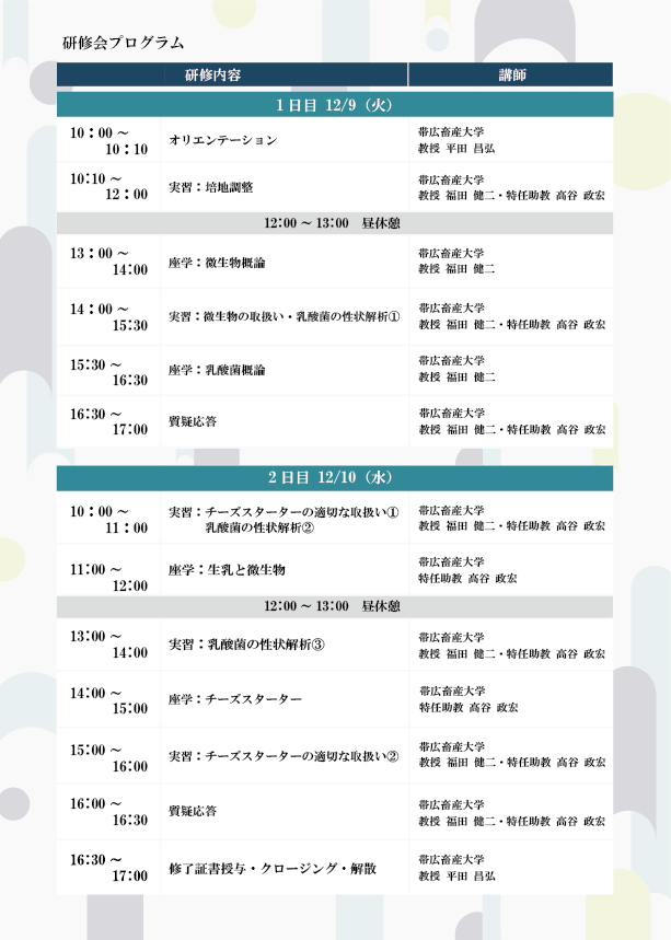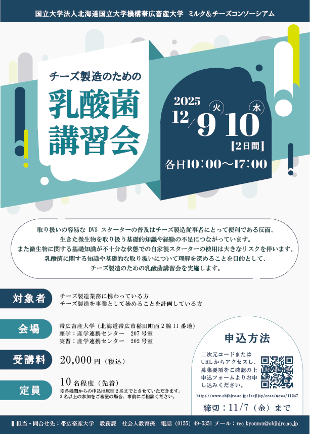 取り扱いの容易な DVS スターターの普及は,チーズ製造従事者にとって便利である反面,生きた微生物を取り扱う基礎的知識や経験の不足につながっています。また,微生物に関する基礎知識が不十分な状態での自家製スターターの使用は大きなリスクを伴います。乳酸菌に関する知識や基礎的な取り扱いについて理解を深めることを目的とし,下記の通りチーズ製造のための乳酸菌講習会を実施します。