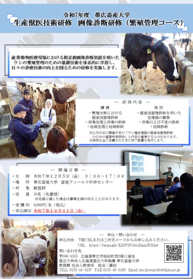 帯広畜産大学では,獣医師を対象として下記のとおり「生産獣医療技術研修 画像診断研修(繁殖管理コース)」を開催します。