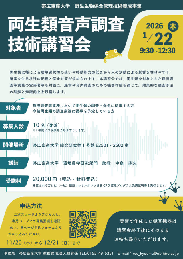 帯広畜産大学野生生物保全管理技術養成事業では,開発事業等に携わる担当者の技術向上を目的に両生類の音声調査に関する講習会を令和8年1月22日(木)に開催します。