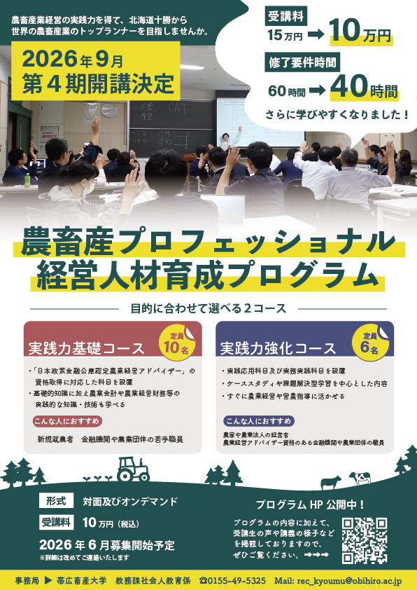 この度,第4期となる令和8年度農畜産プロフェッショナル経営人材育成プログラムを令和8年9月から約半年間にわたり開講いたしますので,受講定員や受講料金を事前にご案内いたします。