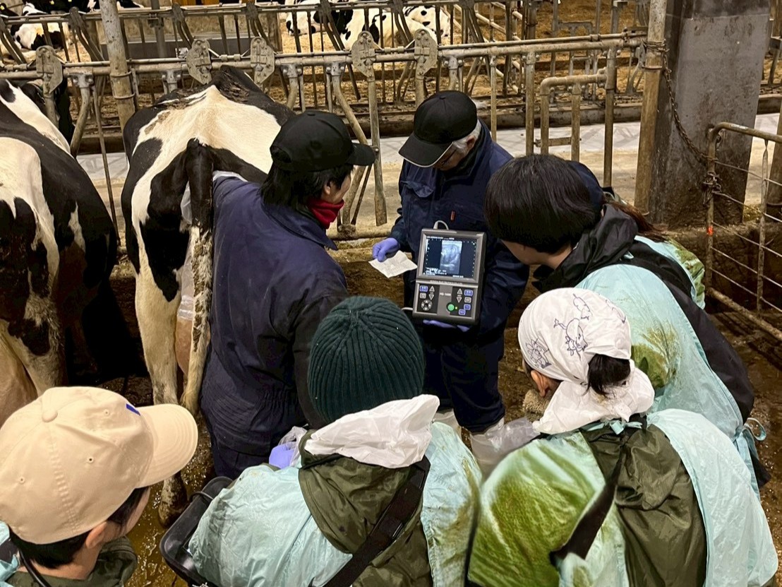 その後の実習講義は,畜産フィールド科学センターで飼育している乳牛を対象に,生殖器検査および人工授精の実習を行い,実践的な技術や判断力の体得に取り組みました。