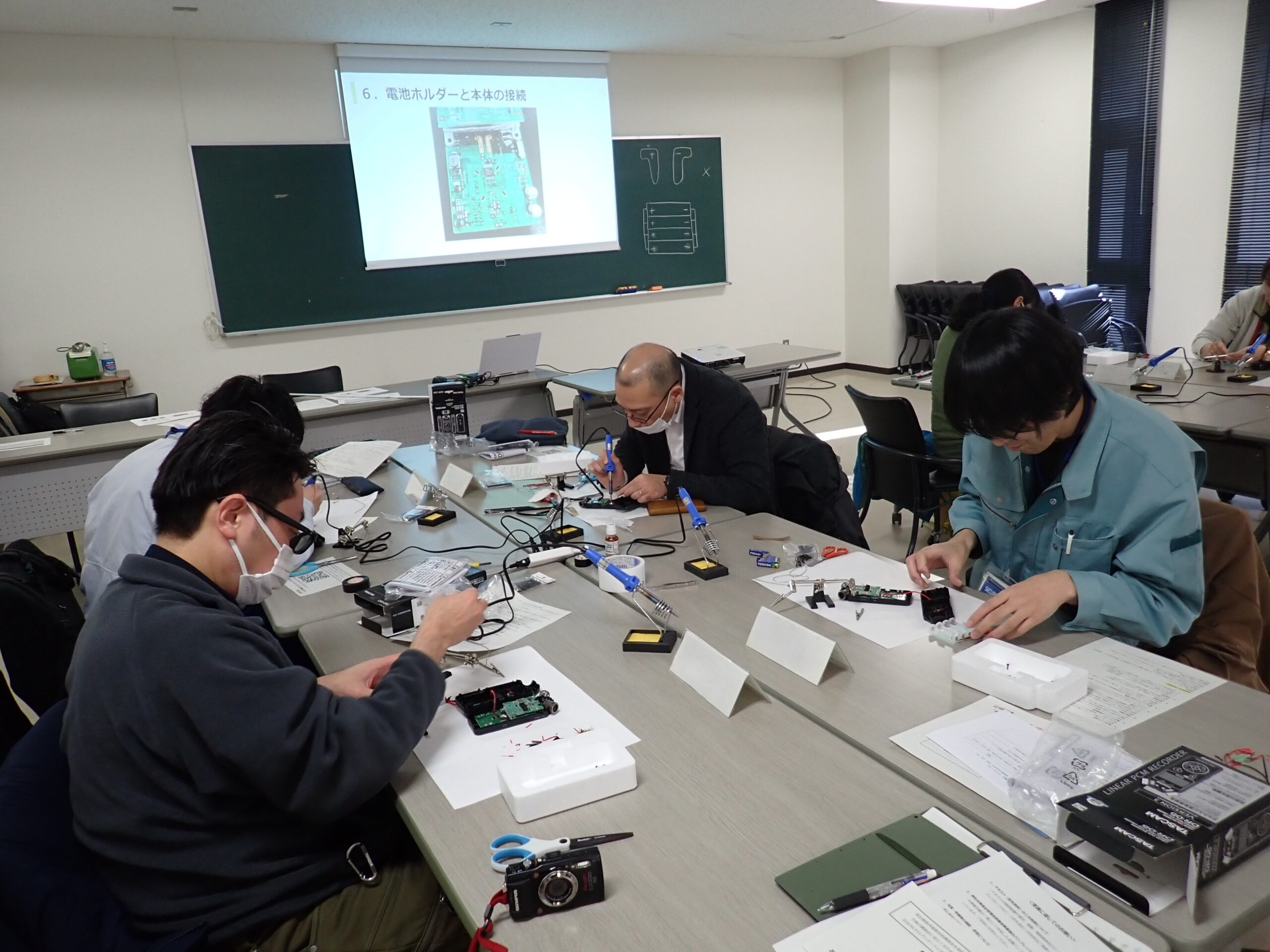 実習では,安価に手に入る市販のIC レコーダーを⽤いて野外の⾳声採集を効率的に⾏うための⾳声調査機器の作成を行いました。講師による各作業工程の手順や注意点等の解説を踏まえて各自作成を行い,最終的に動作確認を終えた音声調査機器は参加者が持ち帰りました。