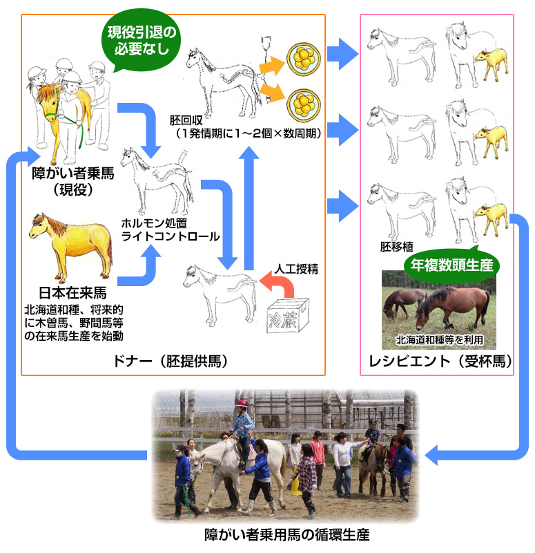 障がい者乗馬に供している現役雌馬から胚移植技術により他の雌馬を利用して複数頭生産する技術を確立する。これにより、畜産研究分野の成果を社会福祉のために貢献していることをアピールする。また、北海道和種をモデルとし将来的には木曽馬や野間馬等の日本在来種の生産性向上のために、本邦での馬胚移植技術の人材育成・普及を目指す。