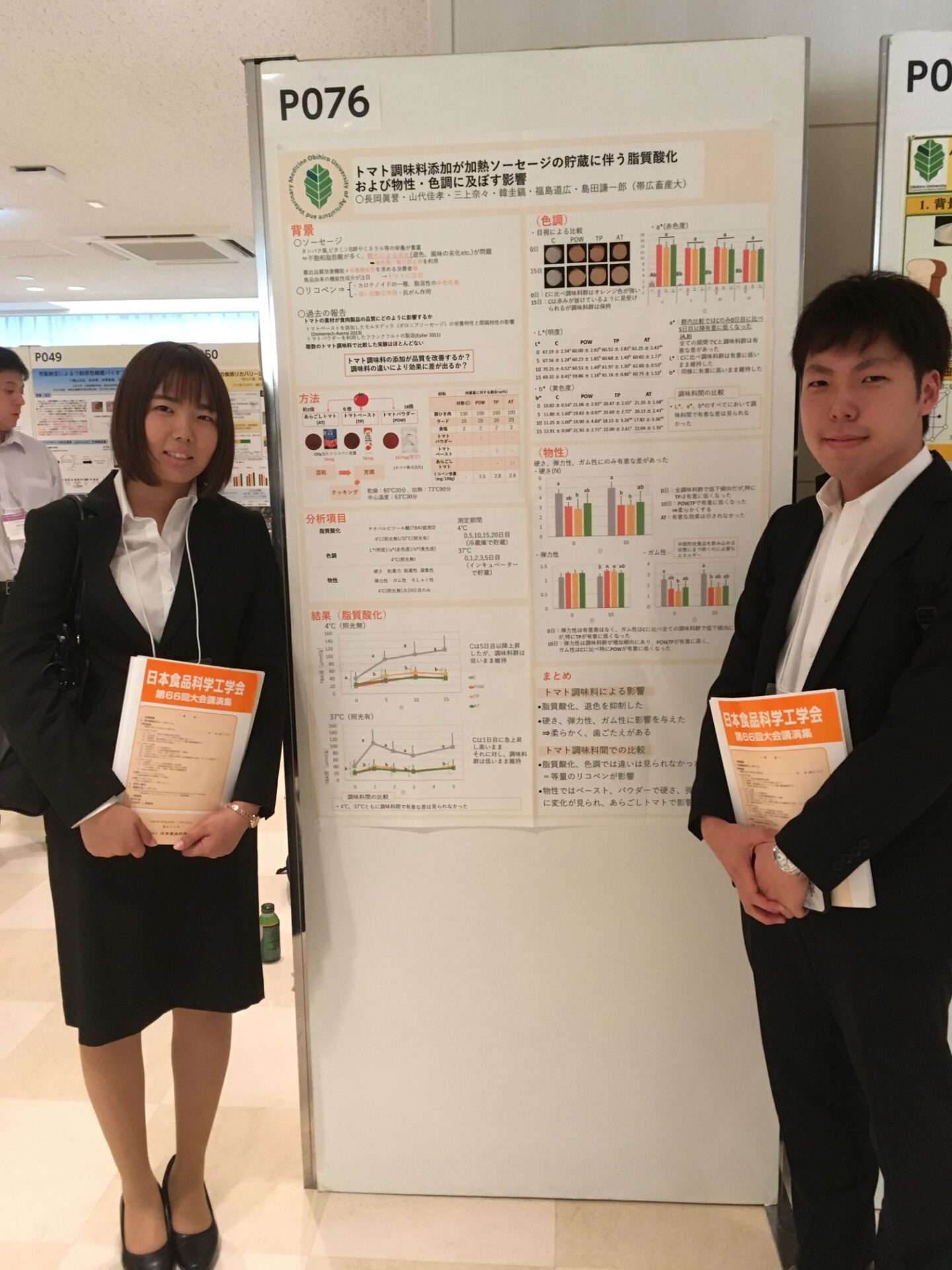 8月29日(木)~31日(土)に札幌の藤女子大学北16条キャンパスで開催された日本食品科学工学会第66回大会において,畜産科学課程4年の長岡眞誉(ながおか しほ)さんが「トマト調味料添加が加熱ソーセージの貯蔵に伴う脂質酸化および物性・色調に及ぼす影響」と題した口頭発表およびポスター発表を行い,若手の会企業賞を受賞しました。