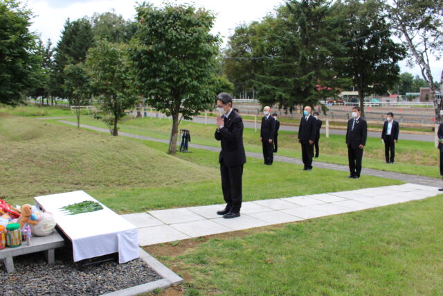 今回の慰霊式は,新型コロナウイルス感染症の感染予防のため,学長,理事,副学長の他,動物医療センター,病理学研究室等,一部の学内教職員のみで執り行いました。