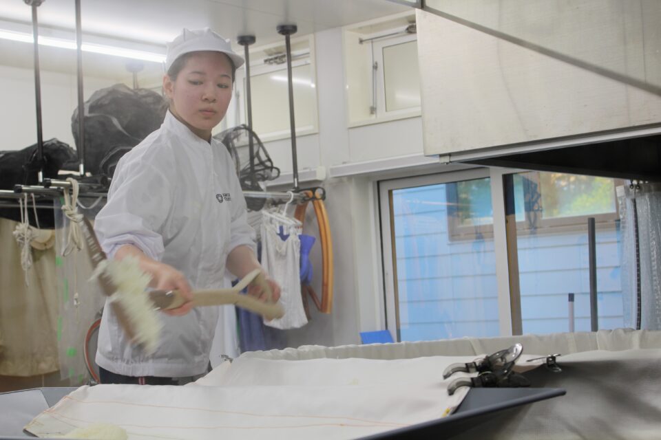 畜産科学課程4年の栗田千晴さんは,「研究室では日本酒の研究をしており,実際に酒蔵での作業を体験したいと思って参加した。米の品種ごとの違いや,同じ品種でも水分の吸い具合が異なるなど,今まで座学で学んでいたことを実感でき,とても勉強になっている。完成したら実家の家族に飲んでもらいたい。」と語りました。