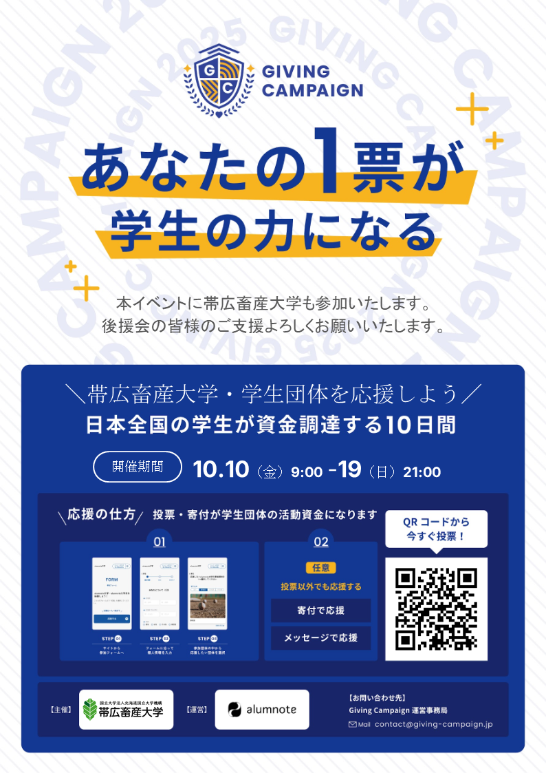 帯広畜産大学では、在校生の課外活動を応援できるオンラインチャリティイベント「Obihiro University of Agriculture and Veterinary Medicin Giving Campaign」を本日から10日間開催いたします。