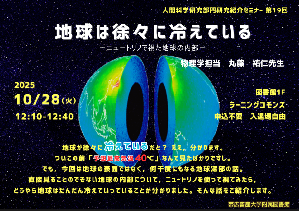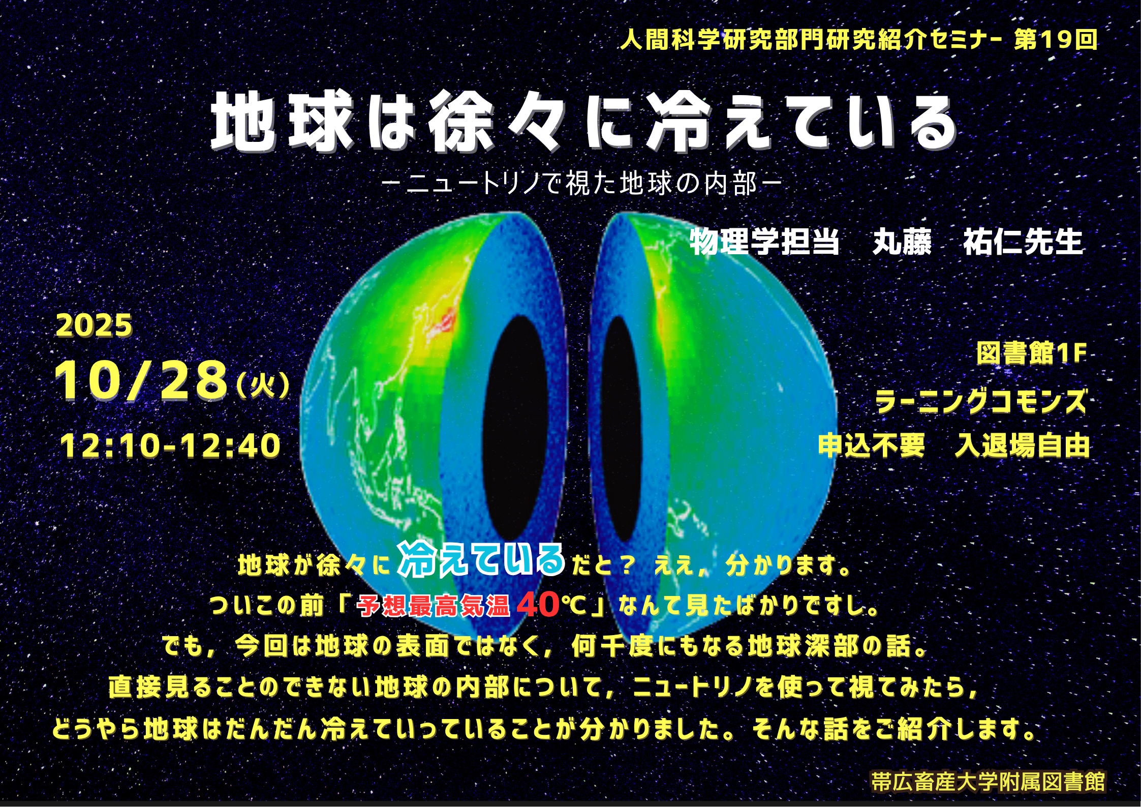 令和7年10月28日(火)に人間科学研究部門 第19回研究紹介セミナー「地球は徐々に冷えている – ニュートリノで視た地球の内部 – 」を下記のとおり開催します。