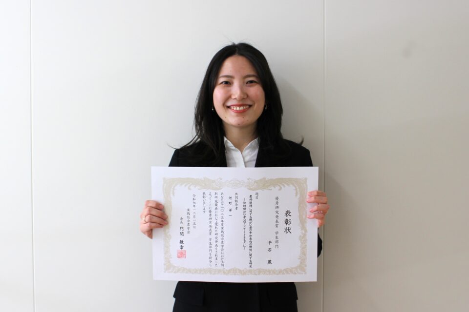 令和7年12月13日(土)に開催された「2025年度実践総合農学会 冬季東京農大大会」において、平石麗さん(農業経済学ユニット4年、指導教員:河野洋一准教授)が優秀研究発表賞(学生部門)を受賞しました。