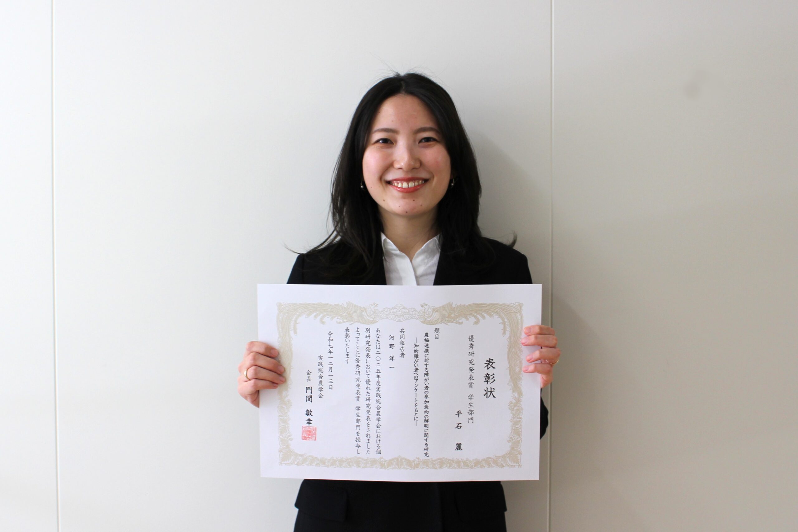 平石さんは、「このような名誉ある賞をいただくことができ、大変嬉しく思います。本研究は、日頃からご指導いただいている先生方や研究室の皆さまの支えによって進めることが出来ました。また、調査にご協力くださった就労支援センター職員・利用者の皆さまに心より感謝申し上げます。今回の受賞を励みに、大学院でも研究に真摯に取り組んでいきたいです。」と喜びを語りました。