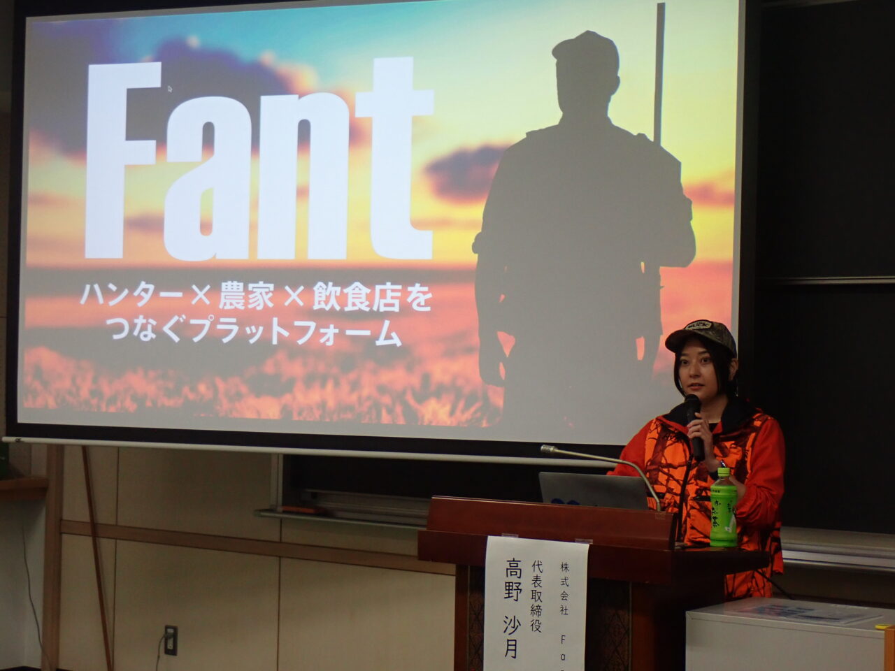 第1回(11月17日)は、「株式会社Fant」代表取締役の高野沙月氏を講師に迎え、「デザイナーからハンターへ!?~目指すのは、狩猟業界のDX化~」をテーマに開催しました。講演では、狩猟業界の現状や同社の取り組み、ジビエ流通における課題についてご講演いただきました。参加者からは、ハンターと飲食店・農家をつなぐビジネスへの関心が高まったとの声が寄せられました。