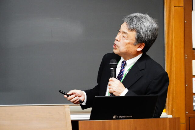 講義では、演題「草資源からの家畜生産の重要性と課題(Importance and challenges of ruminant production from grasses)」のもと、反すう家畜による食料生産の役割について解説が行われました。花田教授は、牛や羊などの反すう家畜が持つ第一胃(ルーメン)内の微生物の働きによって、草などの植物資源を効率的に利用し、動物性タンパク質を生産できる仕組みについて説明しました。