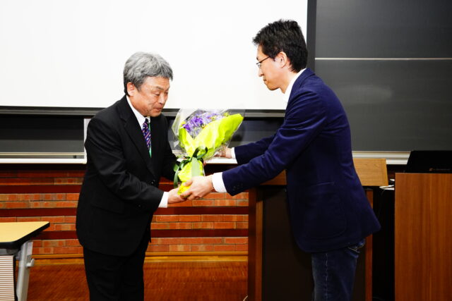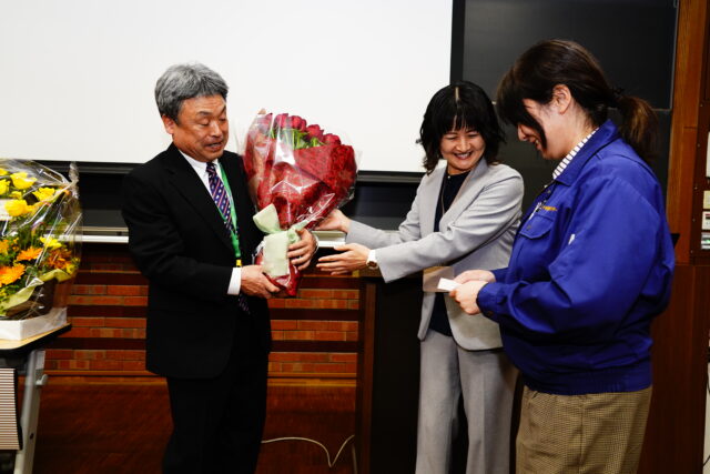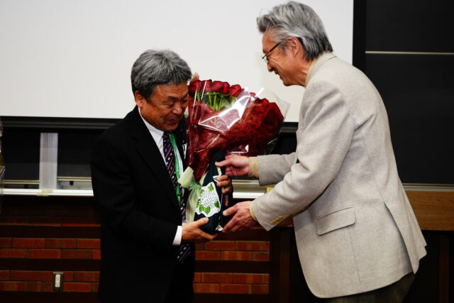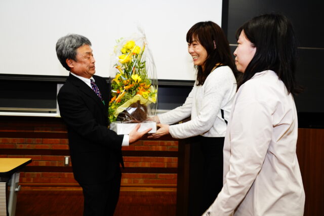 その後、仙北谷副学長から花田教授へ長年の教育・研究への多大な貢献に対する謝辞が述べられた後、関係者から花束が贈呈され、会場からは温かい拍手が送られました。