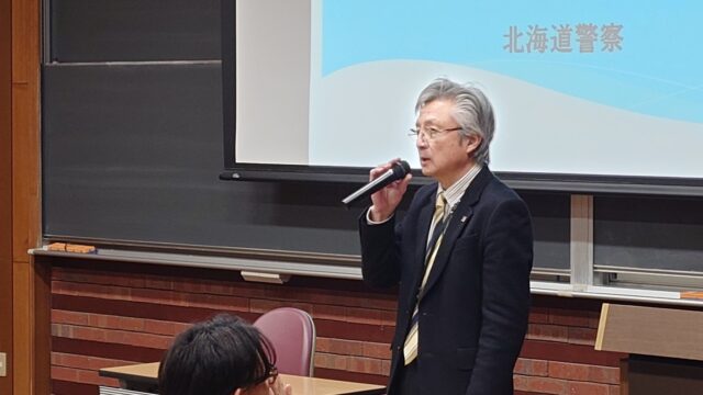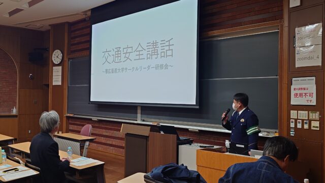 最初に村田学生・課外活動支援室長、続けて仙北谷副学長が挨拶を行った後、帯広警察署から「防犯、交通安全、生活安全、薬物乱用防止等について」をテーマに講話を行っていただきました。