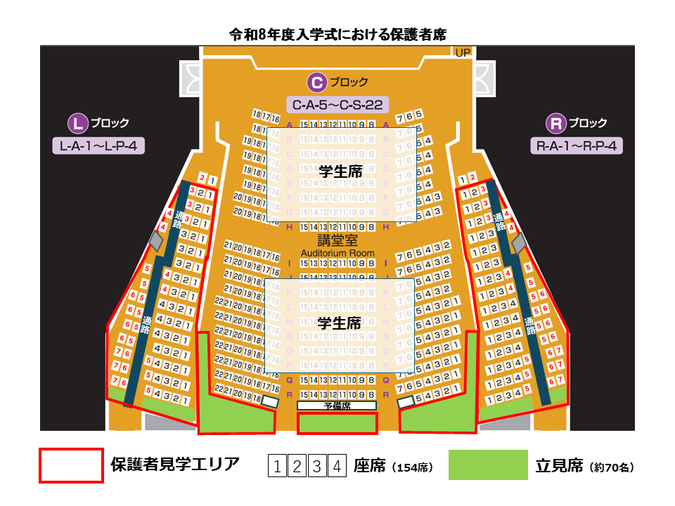 式典会場内に、ご家族等の皆様の席をご用意いたしますが、会場の収容定員の関係から座席数に