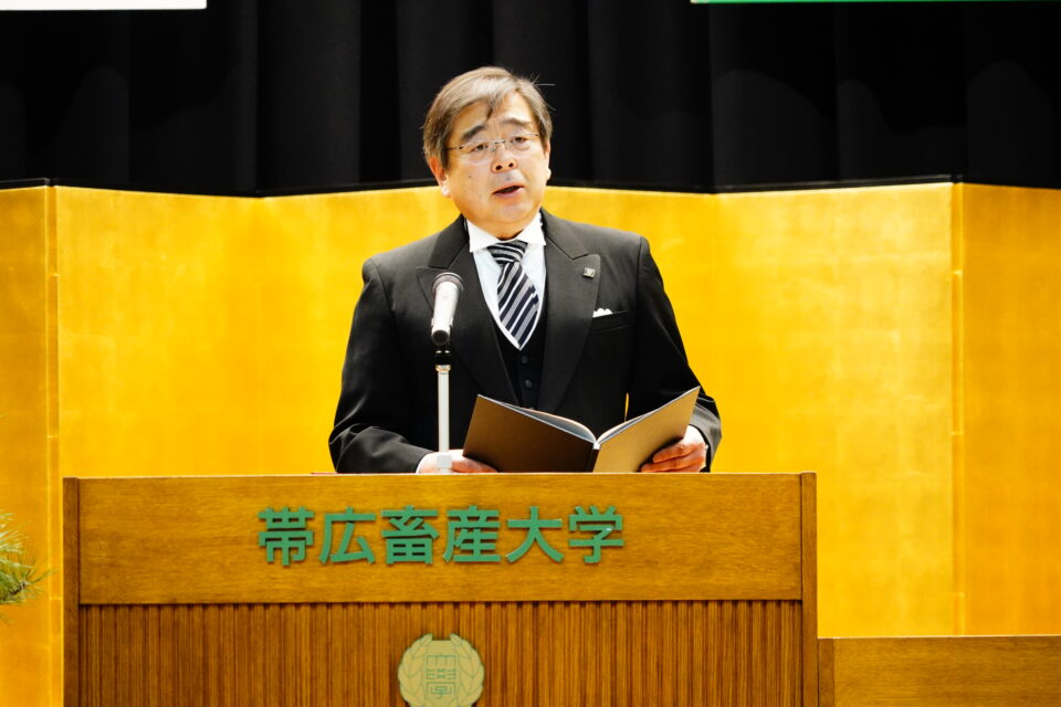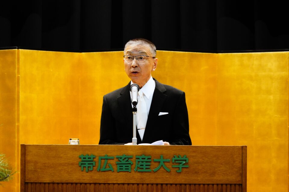次いで長澤学長から告辞が述べられたのち、北海道国立大学機構の長谷山彰理事長による祝辞映像が放映されました。来賓祝辞では、ご臨席いただいた帯広畜産大学同窓会会長の三津原勝様からお祝いの言葉をいただきました。