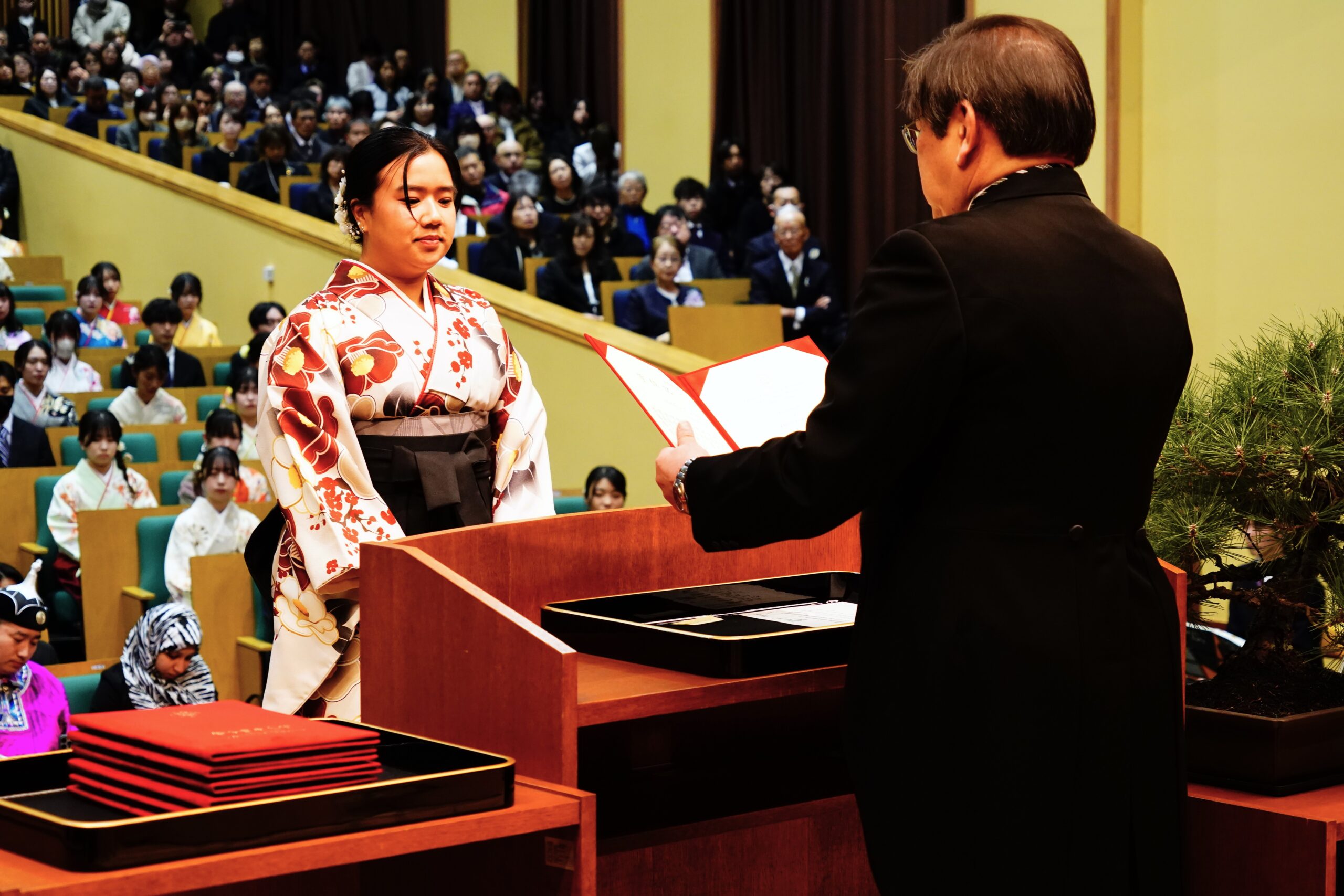 留学生の方々は、環境や文化の違う地おいて、さらに苦労が多かったと思います。卒業あるいは修了の時を迎えられた、すべての皆さんに、心からお祝いを申し上げます。また、ご家族の皆様には、感慨もひとしおのことと推察いたします。誠におめでとうございます。