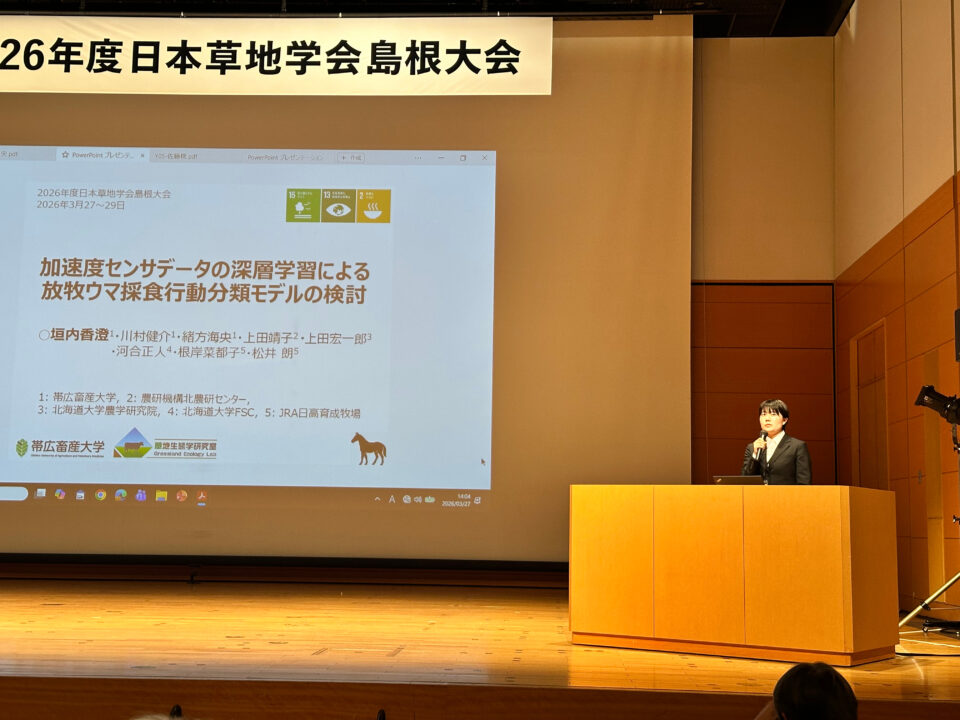2026年度日本草地学会島根大会(3月27日(金)~29日(日):松江テルサ)において、の垣内香澄さん(博士前期課程 畜産科学専攻 環境生態学コース2年、指導教員:川村健介准教授)が優秀若手発表賞を受賞しました。
